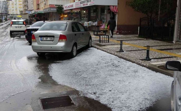 Antalya’nın Manavgat ilçesinde yağışlı hava etkisini sürdürürken, Emek Mahallesinde etkili olan dolu, mahalleyi beyaz örtüyle kapladı.
