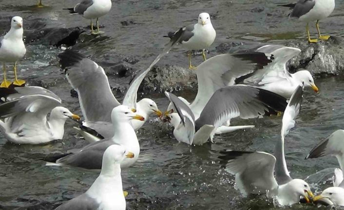 Van Gölü’nde bulunan inci kefali balığının yumurtalarını bırakmak için tatlı su yataklarına göçü devam ederken, balıkları avlamak için birbirleriyle yarışan martılar ilginç görüntüler oluşturuyor.