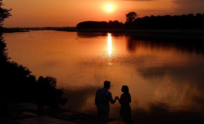 Osmanlı Devleti’ne 92 yıl başkentlik yapan Edirne’deki Meriç Nehri’nde gün batımında ortaya çıkan eşsiz manzara, görenleri kendine hayran bırakıyor.