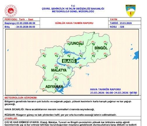 Meteoroloji 13. Bölge Müdürlüğünden yapılan uyarılarda, "Bölgemiz genelinde havanın çok bulutlu ve sağanak yağışlı, yüksek kesimlerin karla karışık yağmur ve kar yağışlı geçeceği, hava sıcaklıklarının mevsim normalleri civarında seyredeceği, rüzgarın güney ve batı yönlerden hafif, yer yer orta kuvvette eseceği tahmin edilmektedir. Elazığ, Malatya, Tunceli ve Bingöl çevrelerinin yüksek kar örtüsüne sahip eğimli kesimlerinde çığ ve kar erimesi tehlikesi bulunduğundan meydana gelebilecek olumsuzluklara karşı dikkatli ve tedbirli olunması önem arz etmektedir" ifadelerine yer verildi.