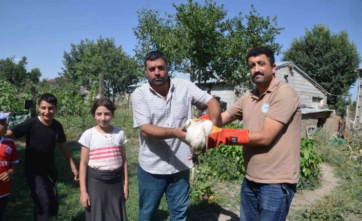 Muş’ta bir evin çatısındaki yuvasından düşerek ayağı kırılan leylek yavrusu tedavi altına alındı.
