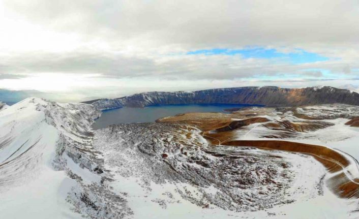 Bitlis’in Tatvan ilçesinde zirvesinde Nemrut Krater Gölü bulunan Nemrut Kalderası, yağan karla birlikte tamamen beyaza büründü.
