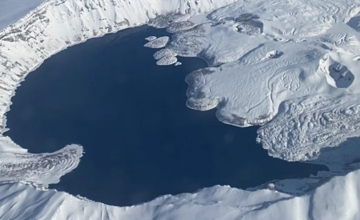 Bitlis’in Ahlat, Güroymak ve Tatvan ilçesi sınırlarında yer alan ve Türkiye’nin en büyük krater gölü olan Nemrut Krater Gölü, uçaktan çekilen kış görüntüleriyle hayran bıraktı.