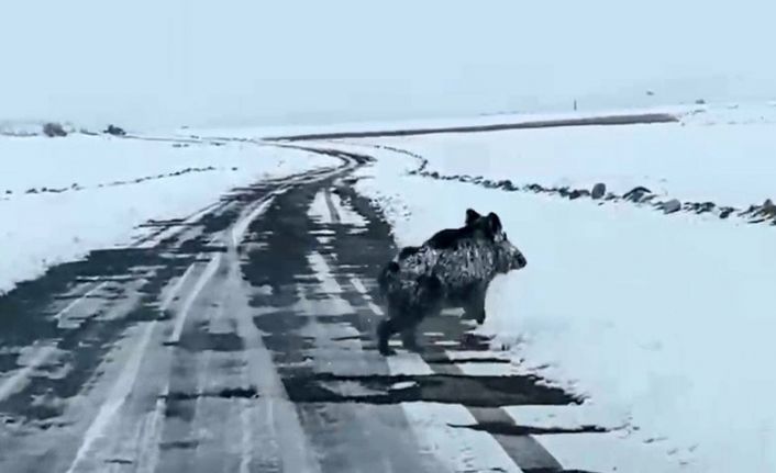 Niğde-Çamardı yolunda ilerleyen bir sürücü, karla kaplı arazide karşılaştığı yaban domuzunu cep telefonuyla kaydetti.