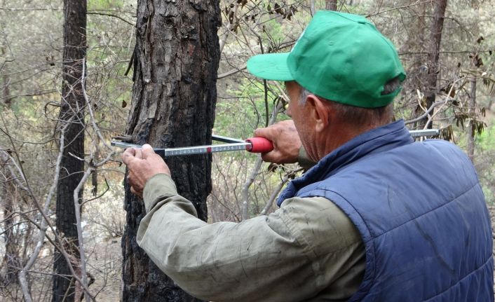 Kozan’da yaklaşık 1650 hektar alanda etkili olan yangının izlerini silmek için yangından etkilenen ağaçlar tek tek orman mühendisleri tarafından damgalanıyor.