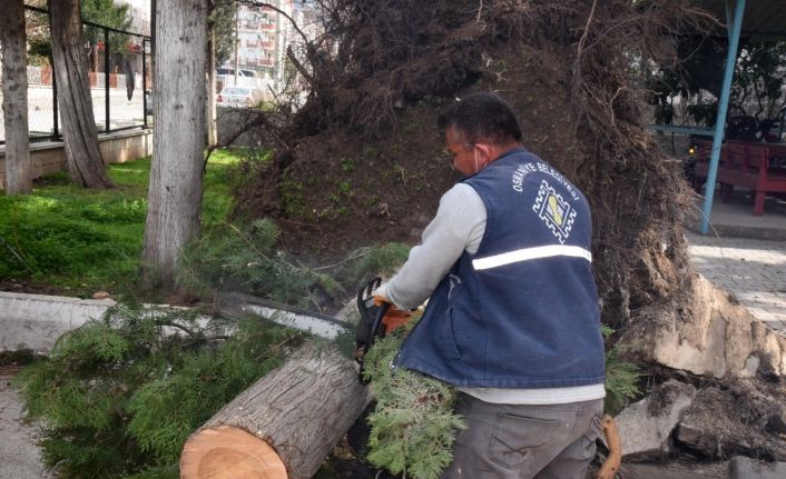 Osmaniye’de etkili olan fırtınada tüm birimleriyle teyakkuza geçen Osmaniye Belediyesi kent genelinde temizlik çalışması başlattı. Fırtınada devrilen ağaçlar kesilerek temizlenirken uçan çatılarda iş makineleri yardımıyla kaldırıldı.
