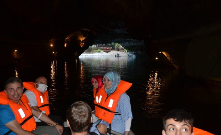 Antalya’nın İbradı ilçesi Ürünlü Mahallesi sınırları içerisinde bulunan mağara yerli ve yabancı ziyaretçilerinin akınına uğruyor. Yaklaşık iki ay içerisinde 20 bin kişinin ziyaret ettiği mağarayı ortalama bir günde ortalama 350 kişi ziyaret etti. Gezi botları ile mağaranın güzelliklerini keşfe çıkan ziyaretçiler, Antalya’nın bu cennet köşesine hayran kaldı.