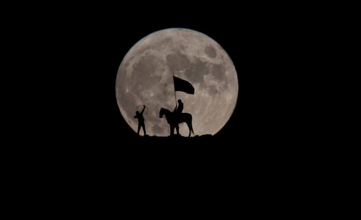 Bayburt’ta akşam saatlerinde ortaya çıkan dolunay, fotoğraf tutkunlarının gözdesi oldu. Dolunayın en güzel hali önüne at, bayrak, okçu gibi objeler koyularak çekildi.