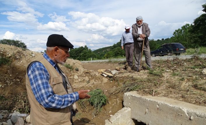 Hisarcık-Yenipınar köy yolunun Bağlaryanı Mevkii’nde bulunan menfezin yol seviyesinden düşük ve dar olduğu için doğru dürüst çalışmadığını söyleyen arazi sahiplerinden Hüseyin Kahveci, ”Şiddetli yağmur bir süre devam ettiğinde selin getirdiği kum ve taşlarla dolan menfezden suyun geçişi olmadığında taşan sel suları ekili alanlarımızı mahvediyor, bir şey bırakmıyor, çürütüyor. Menfez yüksek ve geniş olması lazım. Ben 80 yaşındayım, eşimle birlikte kavun, karpuz, patates ve bazı ürünlerin dikimini, bakımını yapıyor ve 6 ay emek veriyoruz. Sonra sel gelip ürünlerimizi mahvediyor” diye konuştu.