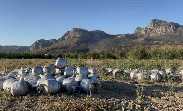Yangın sonrası alevlerin yaklaşması üzerine boşaltılan Bilecik’in Selçik köyünde, patlama riskine karşı boş bir araziye istiflenen mutfak, piknik ve sanayi tipi onlarca tüp ilginç manzaralar oluşturdu.