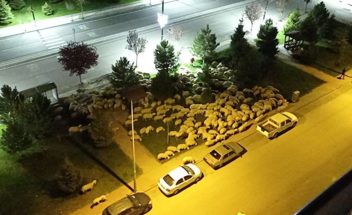 Sivas’ta Alibaba Mahallesinde bir parkta otlayarak ilerleyen koyun sürüsü ilginç görüntüler oluşturdu, o anlar cep telefonu kamerasına yansıdı.