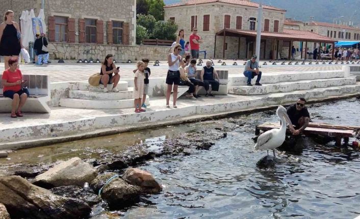 İzmir’in turistik ilçesi Foça’da yazları konaklayan ve vatandaşların ’Tosun’ adını taktığı pelikan yoğun ilgi çekiyor.