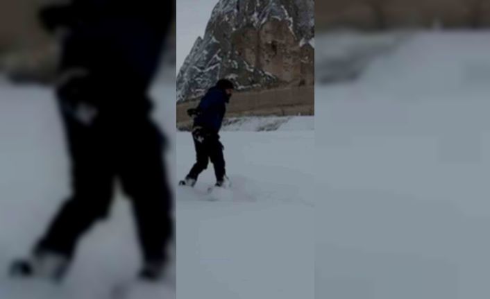 Kapadokya’da kar kartpostallık görüntüler sunarken bazı vatandaşlar, peri bacaları arasında snowboard yaparak karın tadını çıkardı.