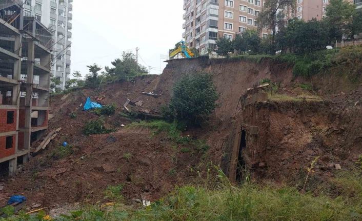 Şiddetli yağışların etkili olduğu Rize’de meydana gelen toprak kaymasında bir binanın önünde bulunan çocuk parkı kullanılamaz hale geldi.