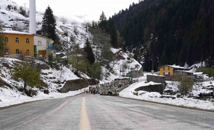 Rize’nin yüksek kesimlerinde geçtiğimiz hafta başlayarak etkisini gösteren kar yağışı İkizdere ilçesine bağlı bin 875 metre rakımdaki Sivrikaya Yaylası ve 2 bin 640 rakımdaki Ovit Yaylası beyaza büründü. Adeta bir gelinlik giymiş gibi bembeyaz görünen doğanın yeşille birleştiği yerlerde en az karlı görüntüler gibi görenleri büyüledi. Kartpostallık görüntüler veren yaylalar herkesi kendisine hayran bıraktı. Karın düşmesiyle yaylacılar da küçükbaş ve büyükbaş hayvanlarıyla köylerine dönüşe geçti. Kara aldırmadan yürüyen hayvanlar yol boyunca renkli görüntülere sahne oldu.