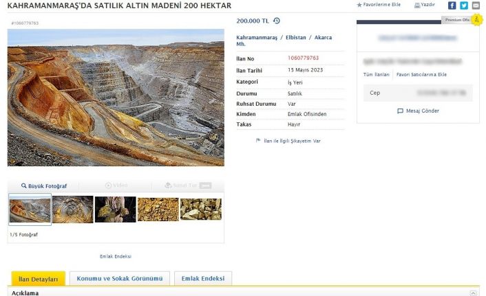 İlçeye bağlı Akarca Mahallesi’nde bulunduğu belirtilen altın madeni, online ilan sitesinde satışa sunuldu. 200 hektarlık alanı kapsadığı belirtilen altın madeni için 200 bin lira gibi bir bedel istendi. 15 Mayıs tarihli ilan, bir gayrimenkul firmasınca verilirken işyeri kategorisinde olduğu ifade edildi. İlanı veren kısmında ise ‘emlak ofisinden’ yazdığı görüldü. Tesisin durumuyla ilgili ‘ikinci el’ notu düşülen ilanda satıcı olarak da Muğla merkezli gayrimenkul firması yer aldı. Firma bilgileri incelendiğinde ise; portföyünde Türkiye’nin farklı şehirlerindeki 9 adet maden ocağı ve 7 adet de otel ye alıyor.