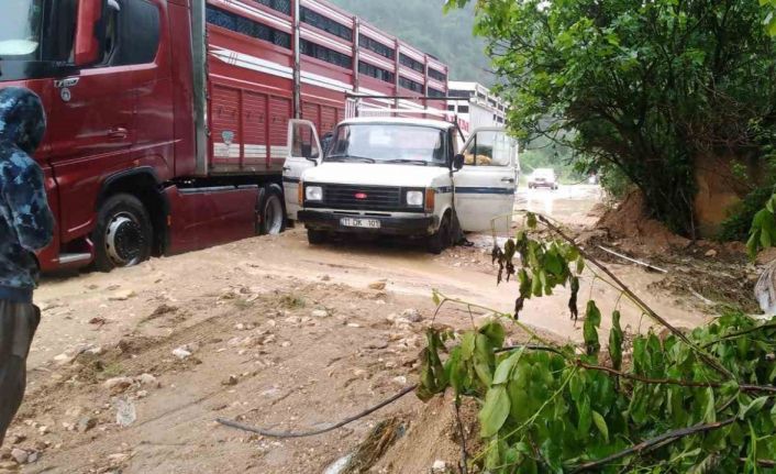 Bilecik’te aniden bastıran sağanak yağış nedeniyle oluşan sel Söğüt-İnhisar kara yolunu ikiye bölerken, araçlar mahsur kaldı.