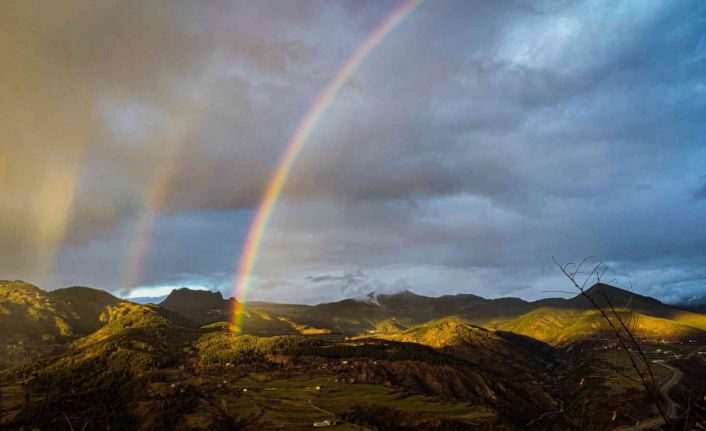 İlçeninı Efkar Tepesinden çekilen görüntülerde, yağmur ardından açan güneşle gökkuşağının muhteşem renkleri ortaya çıktı. İlçenin eşsiz manzarasını arkasına alan görüntülere, Türk bayrağı da eşlik edince ortaya seyrine doyum olmayan anlar çıktı. Çekilen görüntüler sosyal medyada paylaşılınca büyük ilgi gördü.