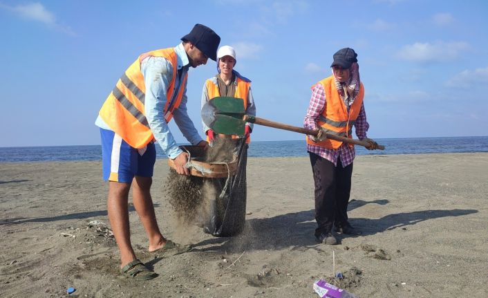 Hatay’ın Samandağ ilçesi sahillerinde Çevre ve Şehircilik İl Müdürlüğü ekipleri, 2 Eylül’de başlayan temizlik çalışmalarını sürdürüyor. 20 kişilik ekip, tırpan ve kürek kullanarak kumsaldan topladıkları atıkların kumlarını eleyip çuvallara dolduruyor.