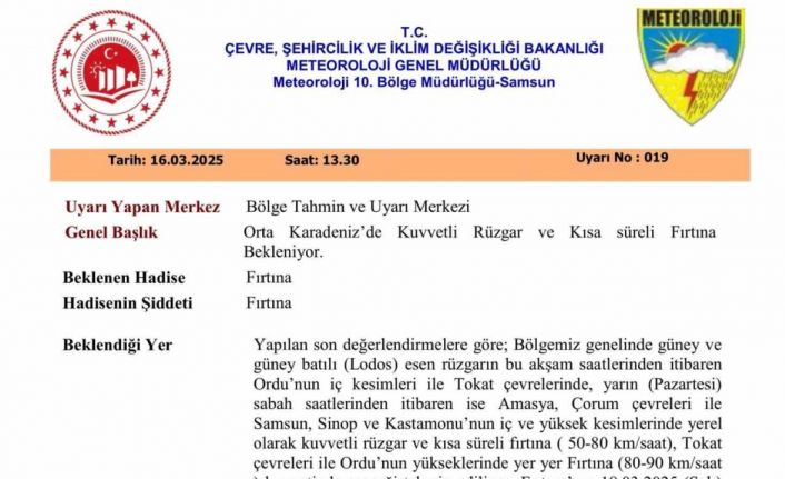 Bölge Tahmin ve Uyarı Merkezi’nden yapılan Orta Karadeniz’de kuvvetli rüzgar ve kısa süreli fırtına başlıklı bilgilendirmede, "Yapılan son değerlendirmelere göre; bölgemiz genelinde güney ve güney batılı (Lodos) esen rüzgarın bu akşam saatlerinden itibaren Ordu’nun iç kesimleri ile Tokat çevrelerinde, yarın sabah saatlerinden itibaren ise Amasya, Çorum çevreleri ile Samsun, Sinop ve Kastamonu’nun iç ve yüksek kesimlerinde yerel olarak kuvvetli rüzgar ve kısa süreli fırtına (50-80 km/saat), Tokat çevreleri ile Ordu’nun yükseklerinde yer yer fırtına (80-90 km/saat) kuvvetinde eseceği tahmin ediliyor. Fırtınanın Salı günü sabah saatlerinde etkisini kaybetmesi bekleniyor. Yaşanabilecek olumsuzluklara (Ağaç ve direk devrilmesi, çatı uçması, toz savrulması, soba ve baca gazı kaynaklı zehirlenmeler gibi) karşı dikkatli ve tedbirli olunması gerekmektedir" ifadeleri kullanıldı.