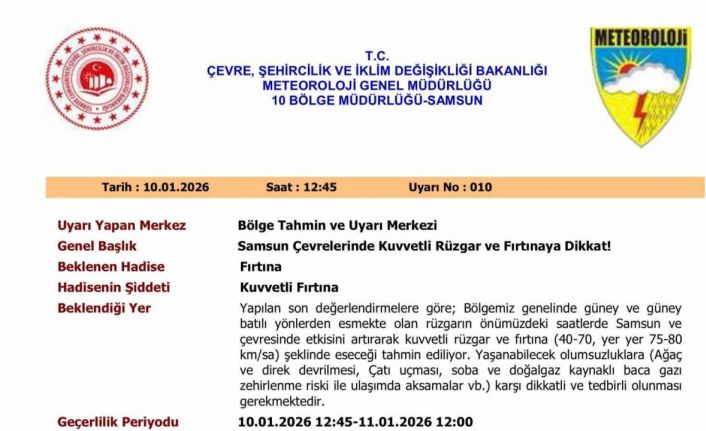 Meteoroloji Genel Müdürlüğü 10. Bölge Müdürlüğü, Samsun ve çevreleri için kuvvetli rüzgar ve fırtına uyarısında bulundu.