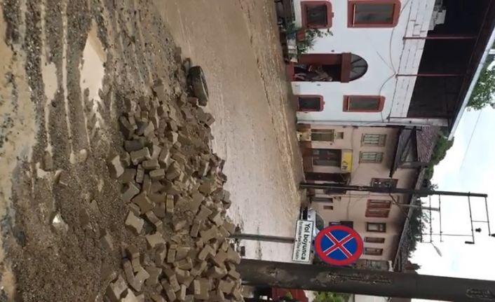 Bursa’nın Mudanya ilçesine bağlı Trilye Mahallesi’nde etkili olan sağanak yağış sonucu ev, iş yerleri ve bir okul sular altında kaldı, kaldırım taşları ise yerinden söküldü.