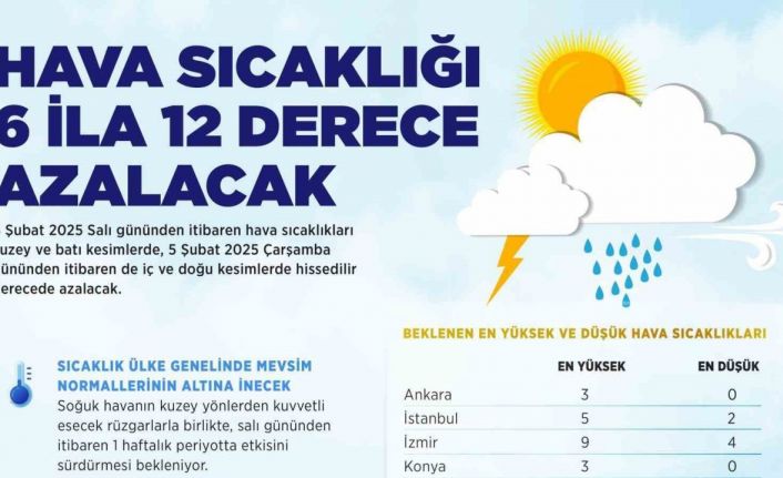 Meteoroloji Genel Müdürlüğü’nün son değerlendirmelerine göre hava sıcaklıklarının 4 Şubat Salı gününden itibaren kuzey ve batı kesimlerde, 5 Şubat Çarşamba gününden itibaren de iç ve doğu kesimlerde 6 ila 12 derece azalması bekleniyor.