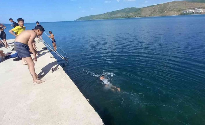 Hava sıcaklığının gün içerisinde 27 derecelere kadar çıktığı Bitlis’in Tatvan ilçesinde sıcaktan bunalan vatandaşların bazıları ilçe sahilindeki gölgelik alanlara ve parklara akın ederken çocuklar ise kendilerini Van Gölü’nün serin sularına bırakıyor. İskeleden Van Gölü’ne atlayan çocuklar, serin suda yüzmenin keyfini sürüyor. Bir yandan Van Gölü’nde yüzerek keyifli anlar geçiren çocuklar diğer yandan ise iskelede güneşlenmeyi ihmal etmiyor.