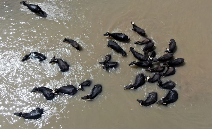 Sivas’ta sıcak havadan bunalan mandalar. Türkiye’nin en uzun nehri Kızılırmak’ta serinliyor.