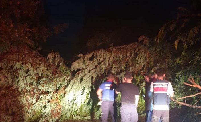 Osmaniye’nin Sumbas ilçesinde etkili olan şiddetli rüzgar ve sağanak nedeniyle yola devrilen ağaçlar itfaiye ekiplerince temizlendi.