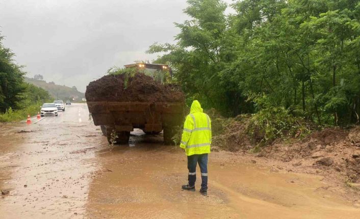 Düzce merkez ile Yığılca ilçesini birbirine bağlayan yolda şiddetli yağış sonrası oluşan heyelan yolu trafiğe kapattı.