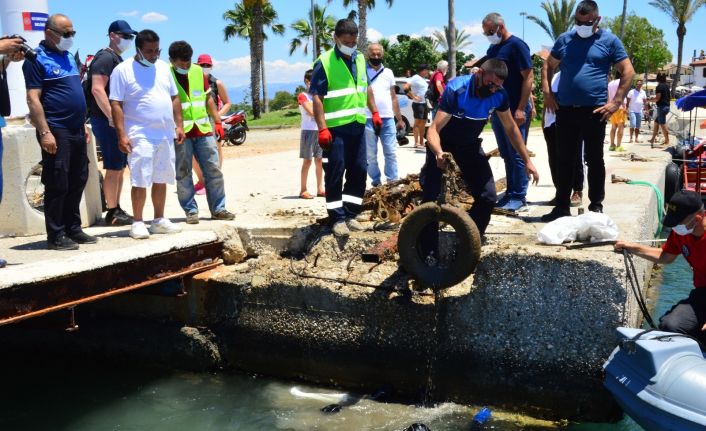 Antalya’nın Side Limanı’nda yapılan sualtı temizliğinde denizden çıkmayan kalmadı. 16 dalgıcın katıldığı temizlikte am ve plastik şişeler, plastik torbalar, balıkçı malzemeleri, demir sürgü kapı parçası ve oto lastiği gibi çeşitli atık maddeler ?denizden çıkarıldı.