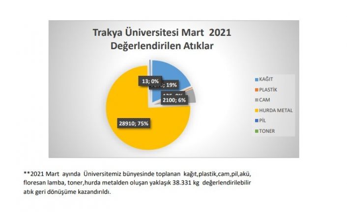 Trakya Üniversitesi Cumhurbaşkanı Sayın Recep Tayyip Erdoğan’ın eşi Emine Erdoğan Hanımefendi himayelerinde, Çevre ve Şehircilik Bakanlığı koordinasyonunda yürütülen ve Birleşmiş Milletler Kalkınma Programı’nın Sürdürülebilir Kalkınma Amaçları Eylem Ödülü’ne layık görülen Sıfır Atık Projesi kapsamında 2021 Mart ayı içerisinde 38 ton 331 kilogram atığı geri dönüşüme kazandırdı.