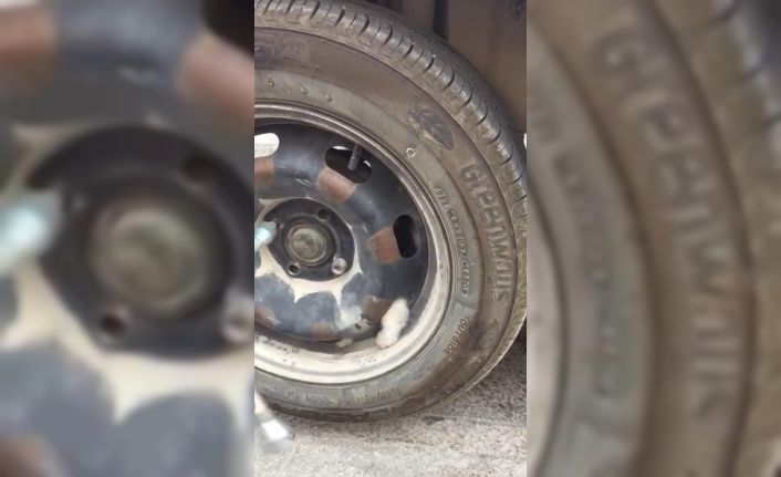 Mersin’de bir otomobilde sıkışan yavru kedi, aracın tekerleği sökülerek kurtarıldı.