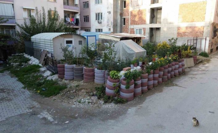 Sinekler üremesin diye topladığı araç lastiklerinden çiçek bahçesi yaptı