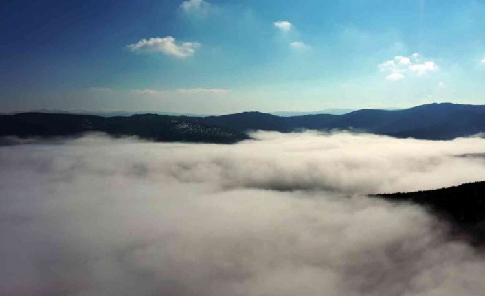 İlçede dağların ve ormanlık alanın üzerini sis tabakası kapladı. Dağların üzerine çökerek adeta denizi andıran sis tabakası, drone ile görüntülendi. Sis sırasında ağaçların dallarında oluşan kırağı da güzel görüntüler oluşturdu. İki bin 100 rakımlı Nalbant yaylası ve Göndelen vadisi sis bulutlarının içinde kaldı.
