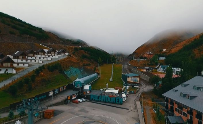 Drone ile havadan görüntülenen Palandöken Kayak Merkezinde yağmur devam ederken görüş mesafesinin ise 10 metreye kadar düştüğü göründü.