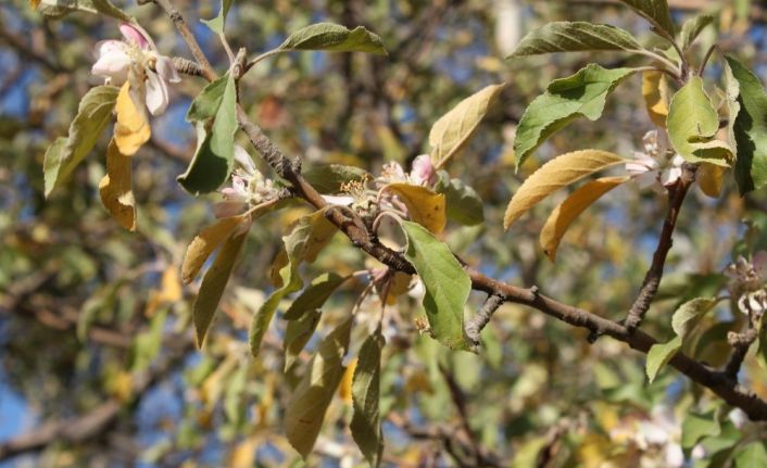 Sivas’ın Gemerek ilçesinde elma ağacının Kasım ayında çiçek açması görenlerin şaşkınlık yaşamasına neden oldu.