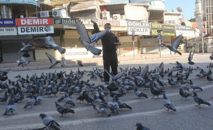 Adana’da bir vatandaş, yeni tip korona virüs nedeniyle sokağa çıkma kısıtlamasında, yiyecek arayan güvercinleri yem atarak aç kalmaktan kurtardı.
