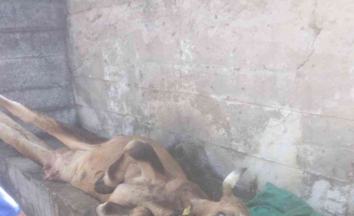 Su oluğuna sıkışan ineği köylüler kurtardı