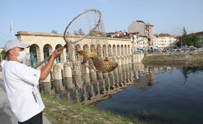 Öte yandan, çalışma esnasında beli kırılmış bir sazan balığı da kanal sularından çıkarıldı. Belinin kırık olmasına rağmen kanal sularında yaşamını sürdürmeye çalışan sazan balığı da göl sularına salındı.