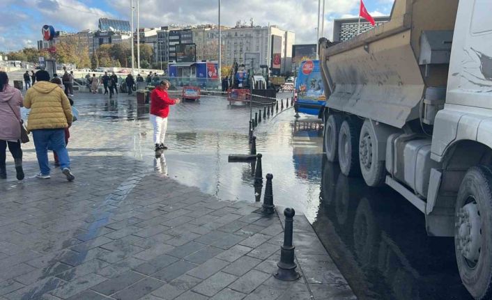 İstanbul Büyükşehir Belediyesi’ne bağlı İstanbul Su ve Kanalizasyon İdaresi (İSKİ) ekipleri tarafından Taksim Meydanı’nda yapılan çalışmalar esnasında iş makinesi su borusunu patlattı. Meydanın bir kısmı sular altında kalırken, suyun patladığı kısım iş makinesi tarafından kapatılarak suyun yükselmesi önlendi. Bazı noktalarda oluşan su birikintileri nedeniyle vatandaşlar yürümekte güçlük çekti. İSKİ ekipleri tarafından yapılan çalışmalar nedeniyle bölgede trafikte aksamalar yaşanırken, çalışmaların devam ettiği öğrenildi.