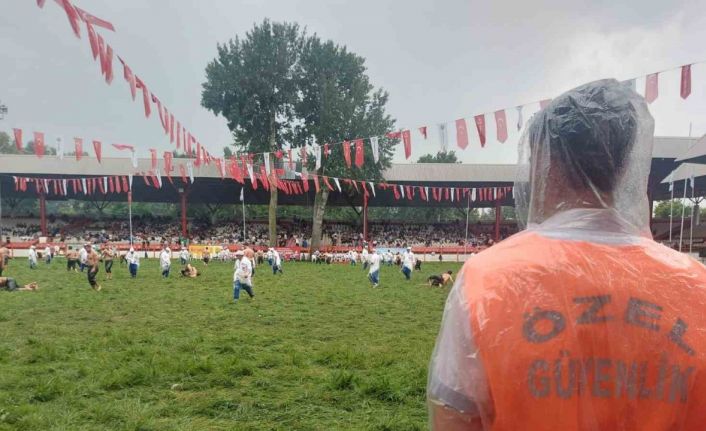 Güreş hakemleri de sağanaktan yağmurluk giyerek korunmaya çalıştı. Yağışa rağmen devam eden mücadeleler, Kırkpınar Yağlı Güreşleri’nin ne kadar önemli bir kültürel değer olduğunu bir kez daha gösterdi.