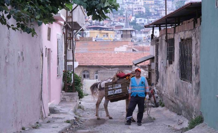 Hatay’ın tarihi Belen ilçesinde araçların giremediği sokaklarda çöp toplama işleri atlarla yapılıyor.