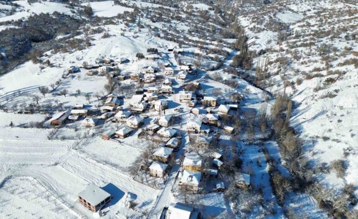 Bolu’nun Göynük ilçesine bağlı Karafakılar köyü, kar yağışının ardından beyaz örtüyle kaplandı. Havadan görüntülenen köyde, karlar altındaki evler ve cami kartpostallık manzaralar oluşturdu.