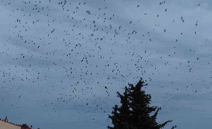 Tekirdağ merkezde karga sürüsü gökyüzünü istila ederken, filmlerdeki korku sahnelerini aratmayan görüntüler ortaya çıktı.
