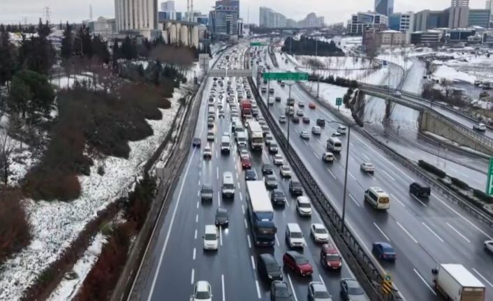İstanbul’da gece etkili olan kar yağışı kent genelini olumsuzsuz etkiledi. Akşam saatlerinde İstanbul genelinde trafik yoğunluğu yüzde 47’ye ulaştı. TEM Otoyolu Mahmutbey Gişeleri’nde trafik havadan görüntülendi.