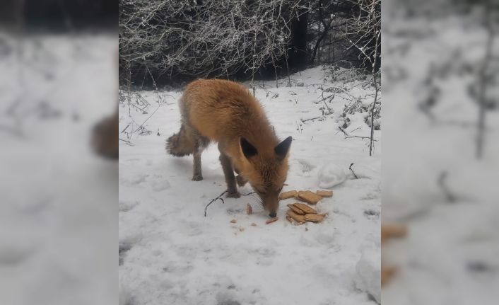 Bolu’da orman yolunda tilkiyle karşılaşan vatandaşlar, yanlarında bulunan bisküvi ile tilkiyi besledi.
