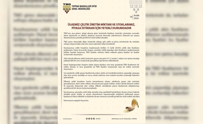 “Hasat başlangıcından bugüne kadar piyasa fiyatları; orta tane gruplarda TMO fiyatlarının bir miktar altında, iri tane gruplarda ise TMO fiyatları seviyesinde veya bir miktar üzerinde oluşmuştur. Son günlerde çeltik piyasa fiyatlarında yukarı yönlü ani hareketlenmelerin yaşandığı, piyasaya olan ürün arzının kesildiği ve sonuç olarak sektörün ürün tedarik etmekte zorlandığı haberleri gelmektedir. Ülkemiz çeltik hasadının henüz tamamlanmış olması, rekoltenin geçen yılın üzerinde gerçekleşmesi, devir stoku miktarı, Kurumumuzun güçlü stokları, üretici elinde bulunan stoklar ile piyasada dolaşımda olan stoklar dikkate alındığında piyasa fiyatlarında dalgalanmayı gerektirecek bir durum bulunmamaktadır. Kuruluşumuz, piyasaları anlık takip etmekte olup spekülatif hareketlerin devam etmesi halinde elindeki güçlü stoklar ve piyasa düzenlemesi kapsamındaki yetkilerini kullanarak piyasa fiyatlarının kabul edilebilir seviyelerde devam etmesine yönelik gerekli her türlü tedbiri alacaktır”.