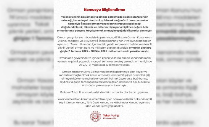 Tokat Valiliği, yaz mevsimiyle birlikte artan sıcaklıklar ve muhtemel yangın riskine karşı yeni tedbirleri kamuoyuyla paylaştı. Valilik tarafından yapılan açıklamada, 6831 sayılı Orman Kanunu ile 5442 sayılı İl İdaresi Kanunu uyarınca alınan kararla, Tokat il sınırları içerisinde belirlenen tescilli piknik alanları, orman parkları ve milli park alanları dışındaki tüm ormanlık alanlara girişlerin 1 Temmuz - 30 Ekim 2025 tarihleri arasında yasaklandığı duyuruldu.